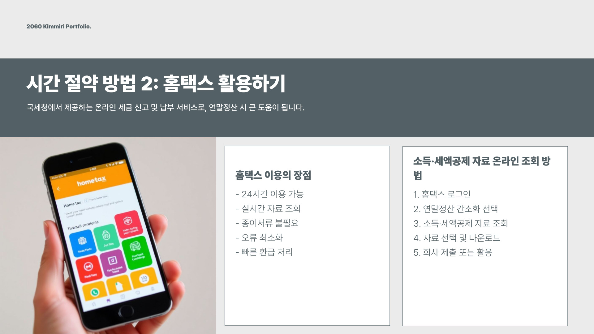 연말정산 시즌이 다가오면 많은 사람들이 복잡한 세무 처리와 서류 준비로 시간과 에너지를 소모하게 됩니다. 이러한 과정에서 효율적으로 시간을 절약하는 방법을 아는 것은 매우 중요합니다. 이번 포스트에서는 개인 연말정산 기간에 시간을 절약할 수 있는 5가지 방법에 대해 알아보겠습니다.