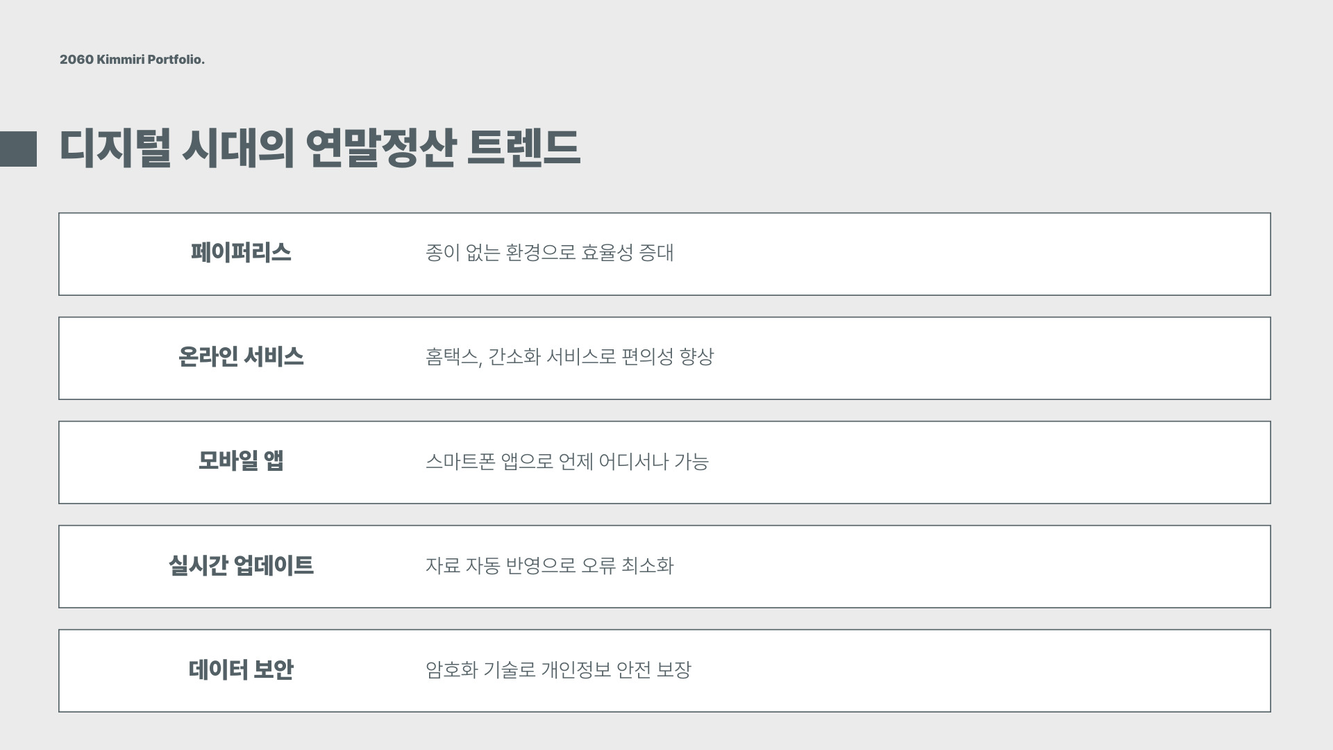 많은 기업에서는 연말정산 자동화 시스템을 도입하고 있습니다. 이 시스템을 활용하면 직원들이 필요한 정보를 입력하면 자동으로 계산되고, 서류가 생성됩니다. 자동화된 시스템을 통해 시간과 노력을 절약할 수 있으며, 직원들은 더 이상 복잡한 계산에 신경 쓸 필요가 없습니다.