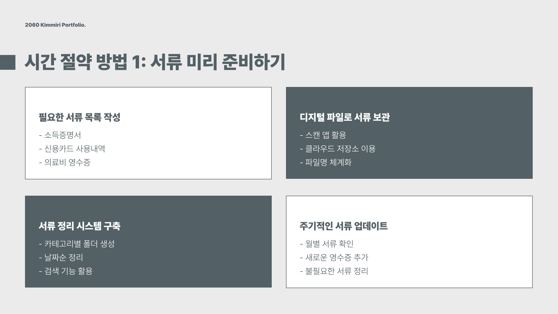 연말정산을 위해 가장 중요한 것은 충분한 준비입니다. 필요한 서류를 미리 준비하면 불필요한 시간 소모를 줄일 수 있습니다. 급하게 서류를 찾거나 준비하는 경우 시간 낭비가 발생하므로, 지난 연도의 소득과 세액공제 관련 서류는 미리 정리해 두는 것이 좋습니다.