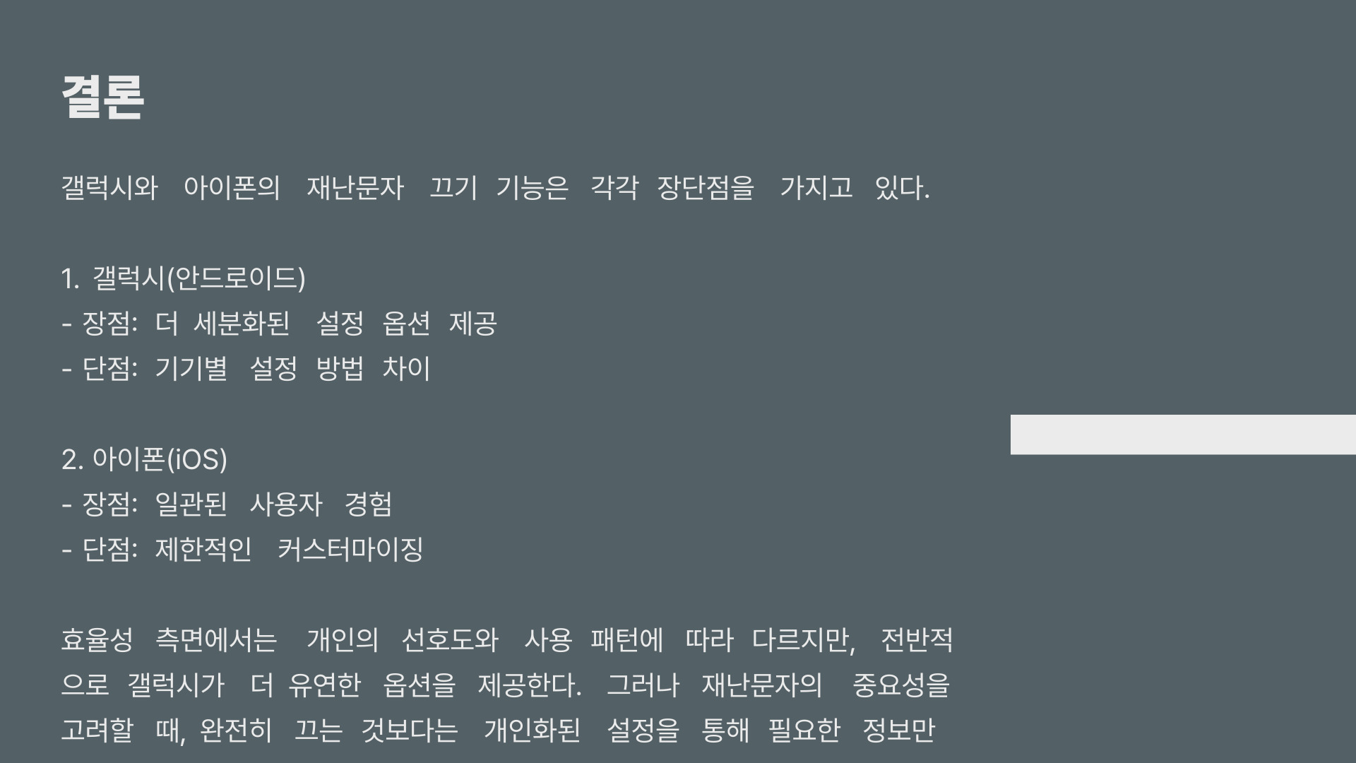 갤럭시와 아이폰 모두 재난문자를 끄는 기능과 접근성이 다르지만, 어느 것이 더 효율적인지는 사용자 개인의 필요에 따라 달라질 수 있습니다. 사용자는 각자의 생활 패턴과 필요한 정보를 고려하여 결정하는 것이 가장 중요합니다.