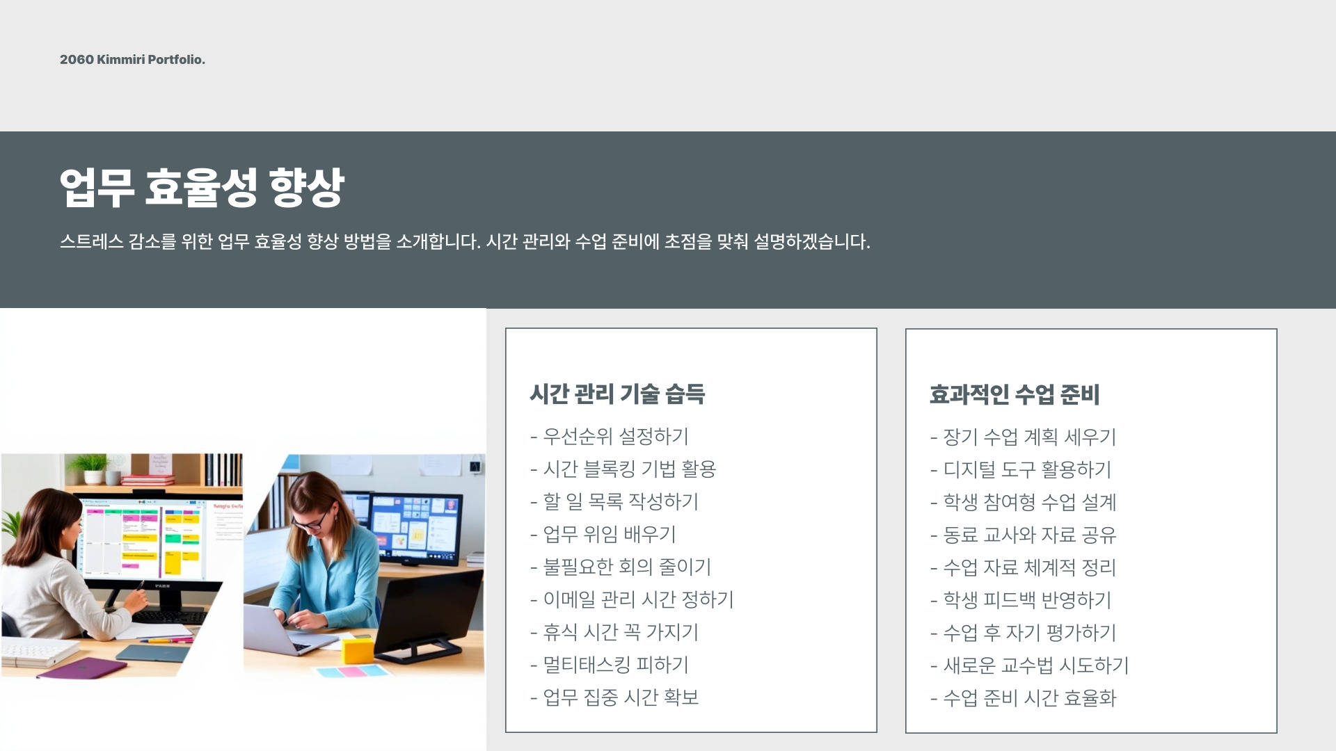 교사가 스트레스를 느끼는 많은 이유 중 하나는 바쁜 업무 환경입니다. 따라서 метод적으로 업무 환경을 개선하는 방법이 필요합니다. 가장 먼저 할 수 있는 것은 업무 우선순위 정하기입니다. 매일 할 일을 목록화하고, 가장 우선해야 할 업무부터 처리함으로써 업무 부담을 줄일 수 있습니다.