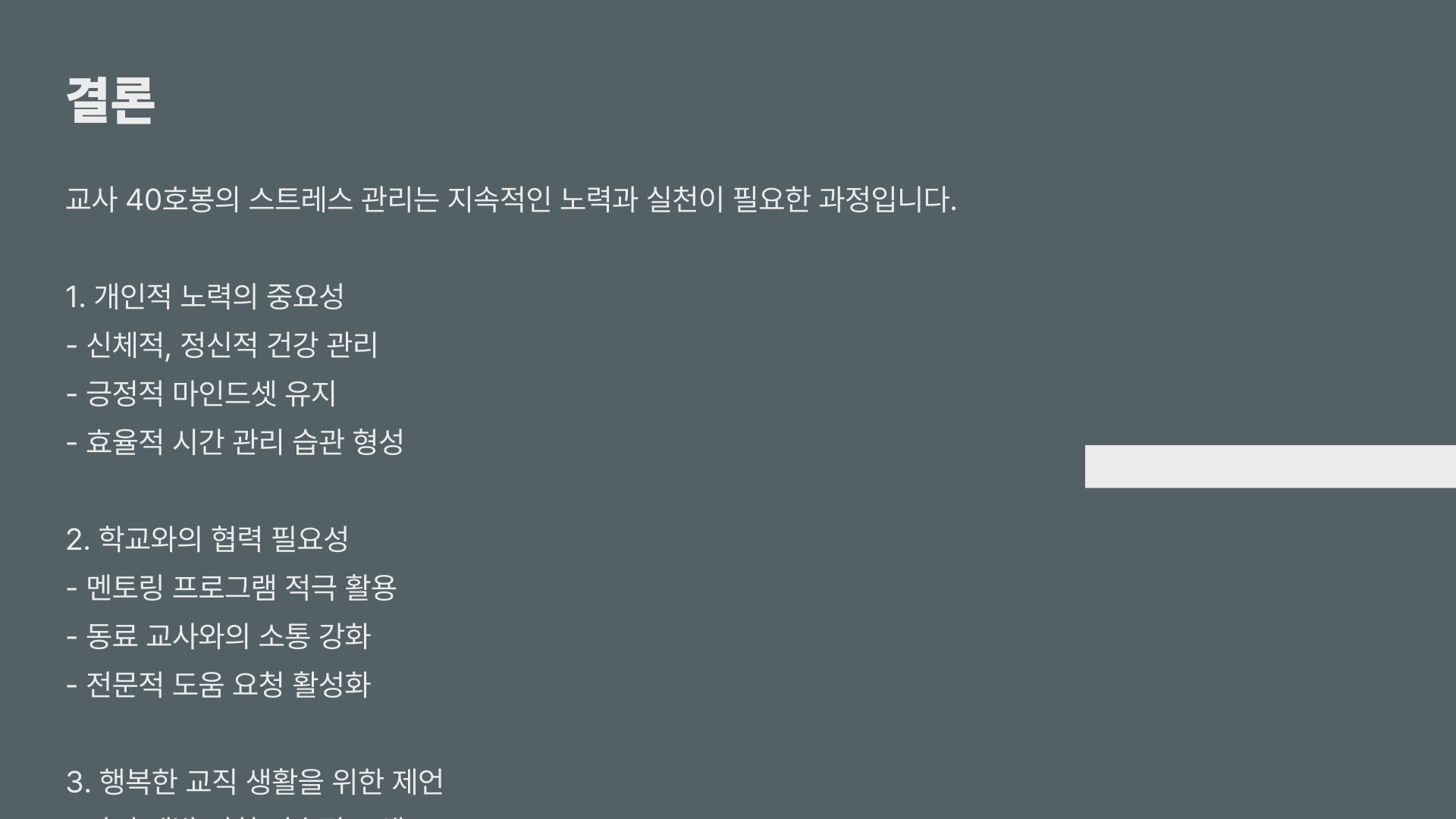 교사 40호봉으로서 경험한 다양한 스트레스는 위의 방법들을 통해 충분히 해결할 수 있습니다. 정신적 관리, 사회적 지지망, 업무 환경 개선을 통해 보다 행복한 교사로 나아갈 수 있습니다. 우리의 학생들에게 더 나은 교육을 제공하기 위해서는 먼저 우리 자신이 건강해야 한다는 사실을 잊지 말아야 할 것입니다.