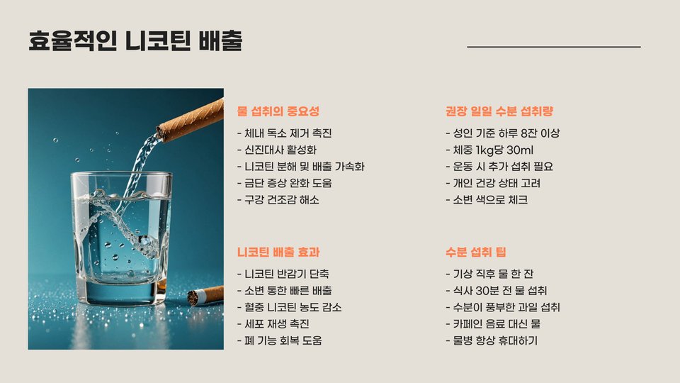 몸에서 니코틴을 효율적으로 배출하기 위해서는 여러 가지 방법들이 있습니다. 그 중에서도 물을 충분히 섭취하는 것이 가장 기본적이고 효과적인 방법 중 하나입니다. 체내 수분이 많을수록 신진대사가 활발해지고, 이는 니코틴의 배출을 도울 수 있습니다. 하루 최소 2리터의 물을 마시는 것이 좋습니다.