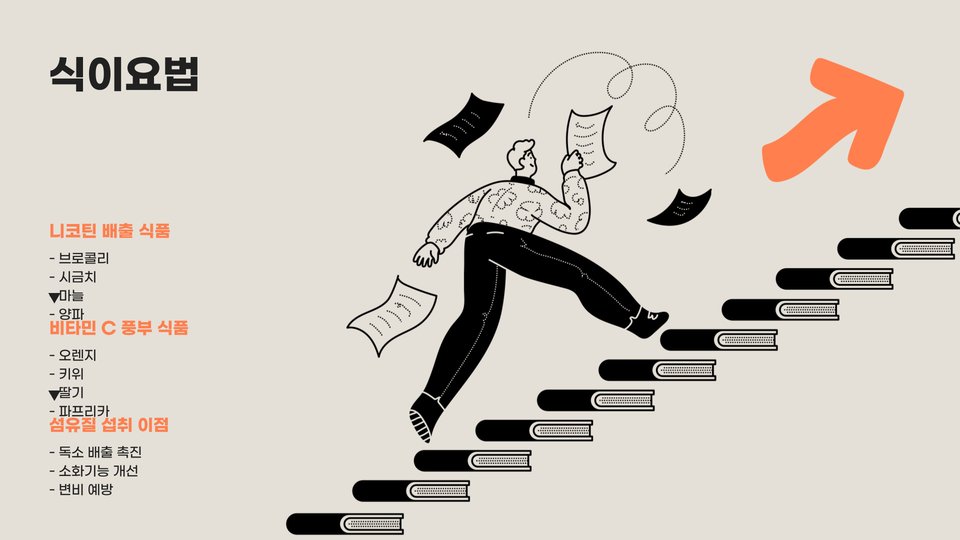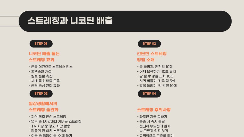 - 규칙적인 운동이 니코틴 배출에 효과적입니다.