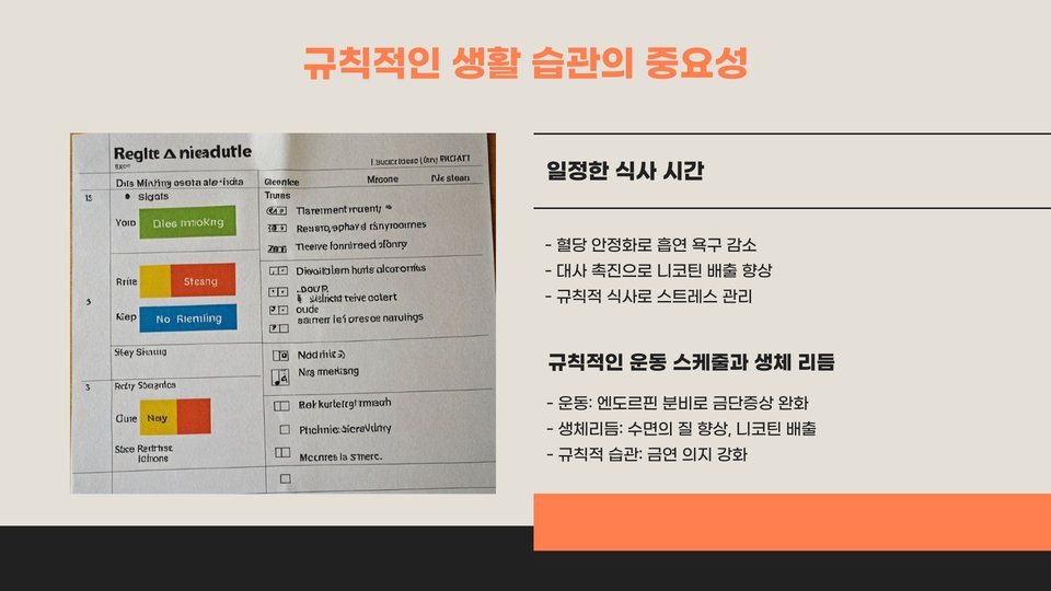 니코틴을 배출하는 과정에서 정신적인 준비도 매우 중요합니다. 금연을 결심한 후에는 지원 그룹에 참여하거나 친구와 가족의 지지를 받는 것이 좋습니다. 이런 지원은 스트레스를 줄이고 긍정적인 마음가짐을 유지하는 데 도움을 줍니다. 필요 시 전문가의 상담을 받는 것도 좋은 방법입니다. 정신적 준비와 지지를 통해 니코틴 배출 과정을 더욱 원활하게 진행할 수 있습니다.