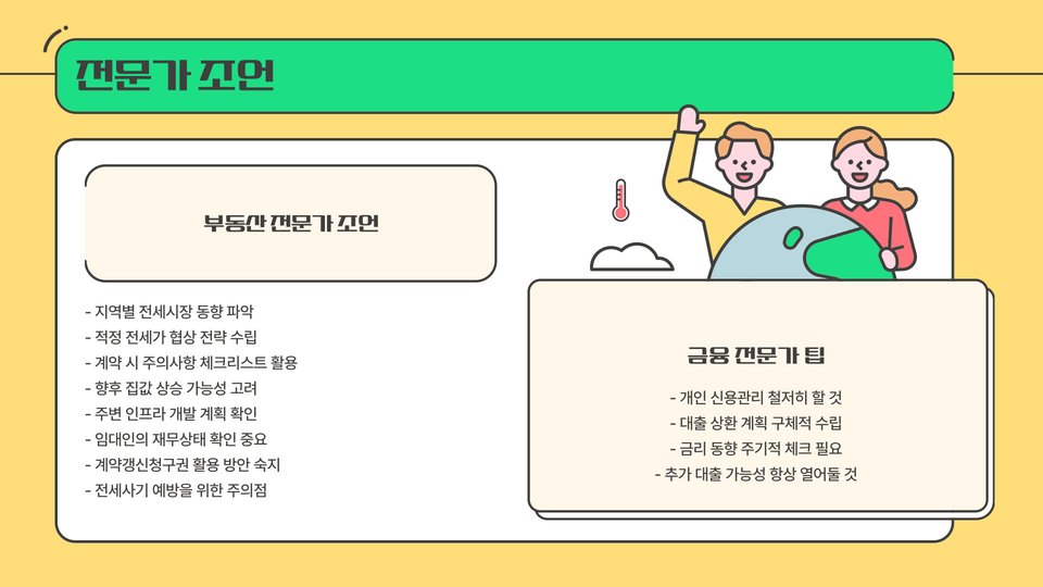 마지막으로, 주변 시세 조사를 통해 현명한 결정이 필요합니다. 대출 금액과 전세 시세를 비교하여 적절한 전세금을 설정하는 것이 중요합니다. 이를 통해 불필요한 추가 비용을 줄이고, 대출 이자에 대한 부담도 덜 수 있습니다. 버팀목전세대출을 통해 안전하고 안정적인 주거 환경을 만들어 보세요.
