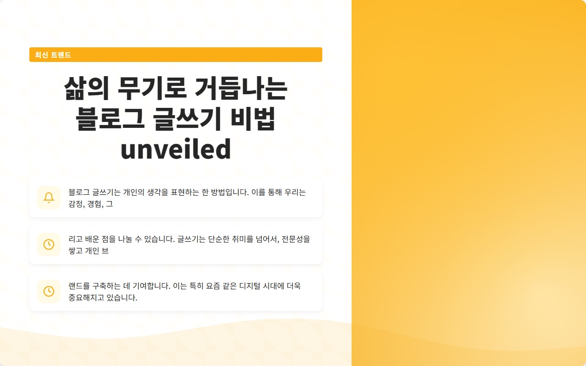 블로그 글쓰기는 단순하게 정보를 전달하는 것 이상입니다. 이 과정은 개인의 성장과 변화의 도구가 됩니다. 블로그를 통해 자신을 표현하고, 다양한 사람들과의 소통을 통해 새로운 관점을 얻을 수 있습니다. 또한, 글을 쓰는 과정을 통해 자신의 생각을 정리하고 더 명료하게 표현할 수 있는 능력을 기를 수 있습니다.