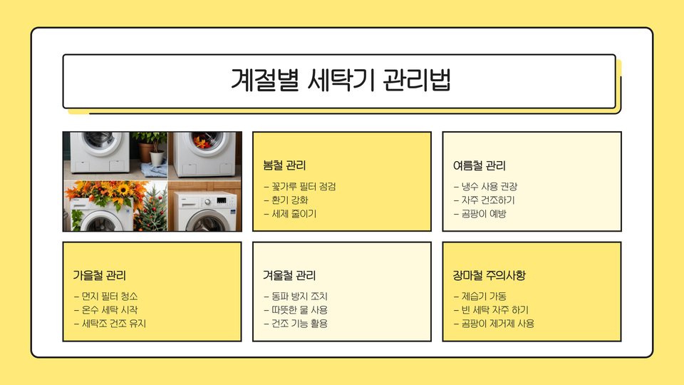 마지막으로, 세탁기 필터도 정기적으로 청소하여 물의 흐름을 원활하게 유지하는 것이 좋습니다. 이러한 작은 습관들이 세탁기를 더 오래 사용하게 하고, 청결한 세탁을 보장할 수 있습니다.