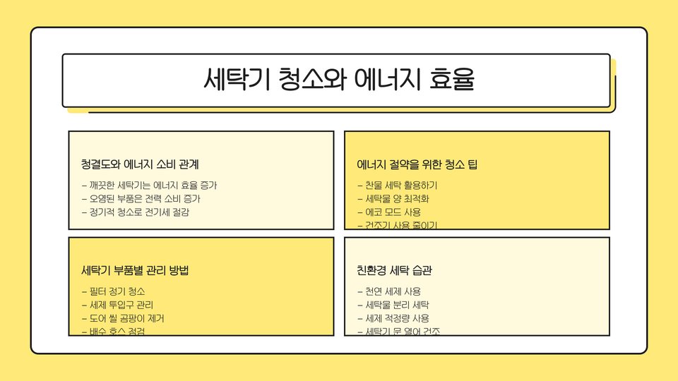 또한, 세탁기를 청소함으로써 에너지 소비를 줄일 수 있습니다. 세탁기가 효율적으로 작동하면 전기 요금도 절감할 수 있습니다. 따라서 세탁기 청소는 경제적인 측면에서도 매우 중요합니다.