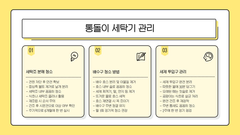 세탁기 청소는 곰팡이를 효과적으로 제거하고 예방하는 데 필수적입니다. 정기적인 관리와 올바른 청소 방법을 통해 세탁기를 항상 청결하게 유지하면, 더 건강하고 깨끗한 세탁 결과를 얻을 수 있습니다. 세탁기 청소법을 실천하여 곰팡이 문제를 극복하고, 항상 쾌적한 세탁 환경을 유지하세요. 세탁기가 깨끗할수록 우리의 삶도 더 건강해질 것입니다.