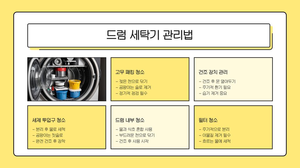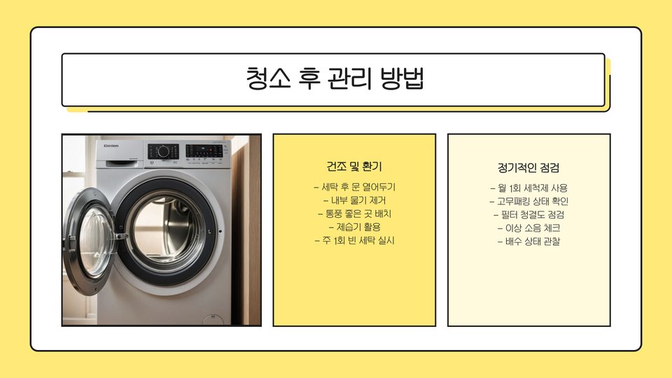 세탁기를 청소한 후에는 예방 조치를 취하는 것이 중요합니다. 세탁 후에는 항상 드럼을 열어 두어 내부가 마르게 해야 하며, 주기적으로 세탁기를 청소하는 습관을 들이는 것이 좋습니다. 또한, 세탁할 때는 너무 많은 세제를 사용하지 않도록 주의해야 합니다. 세제가 과도하게 사용될 경우, 잔여물이 남아 곰팡이가 발생할 수 있습니다.