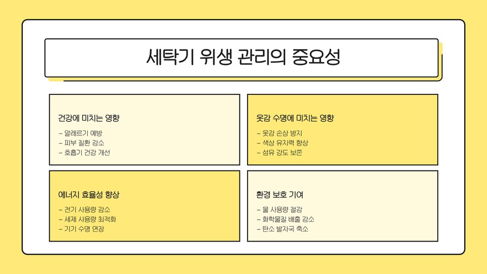 세탁기 청소는 단순히 위생적인 문제를 넘어서, 세탁기의 수명과 성능에도 큰 영향을 미칩니다. 정기적으로 청소하지 않으면, 세탁기 내부의 부품이 고장나거나 세탁 성능이 저하될 수 있습니다. 예를 들어, 곰팡이가 세탁기 드럼에 생기면 세탁물에 곰팡이 냄새가 배어들게 되고, 이는 세탁물의 품질에 좋지 않은 영향을 미칩니다.