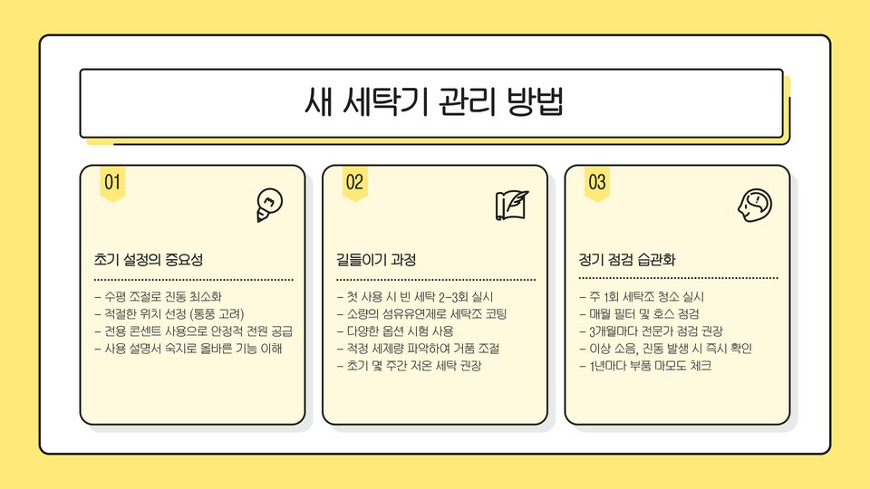 마지막으로, 세탁기 필터도 정기적으로 청소하여 물의 흐름을 원활하게 유지하는 것이 좋습니다. 이러한 작은 습관들이 세탁기를 더 오래 사용하게 하고, 청결한 세탁을 보장할 수 있습니다.