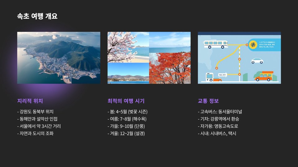 속초는 아름다운 자연 경관과 풍부한 문화유산이 어우러진 도시로, 강원도 동해안에 위치해 있습니다. 특히 속초 해변은 매년 많은 관광객을 끌어들이는 명소 중 하나입니다. 이 외에도 속초의 다양한 관광지와 활동은 가족 단위 여행객에게 적합한 장소로 알려져 있습니다. 아이와 함께하는 여행에 알맞은 곳들이 많아 더욱 매력적입니다.
