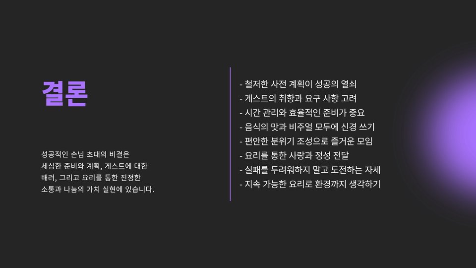 손님 초대 요리는 단순한 음식 준비를 넘어서, 손님과의 소통과 분위기 조성이 중요한 요소입니다. 상대방의 기호를 고려하고, 효율적인 메뉴 구성으로 손님을 맞이하는 것이 핵심입니다. 이 글에서 소개한 노하우를 활용하여 다음 손님 초대에서 멋진 경험을 만들어 보세요.
