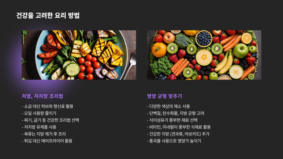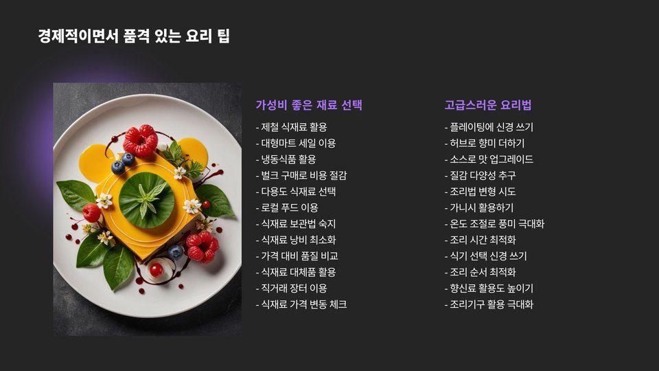 - 신선한 재료를 선택하고, 계절에 맞는 농산물을 활용하라.