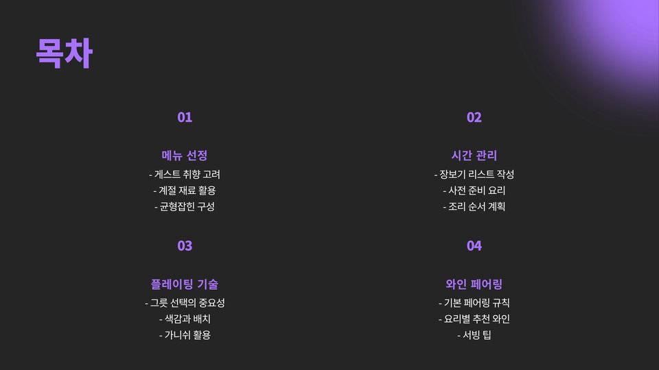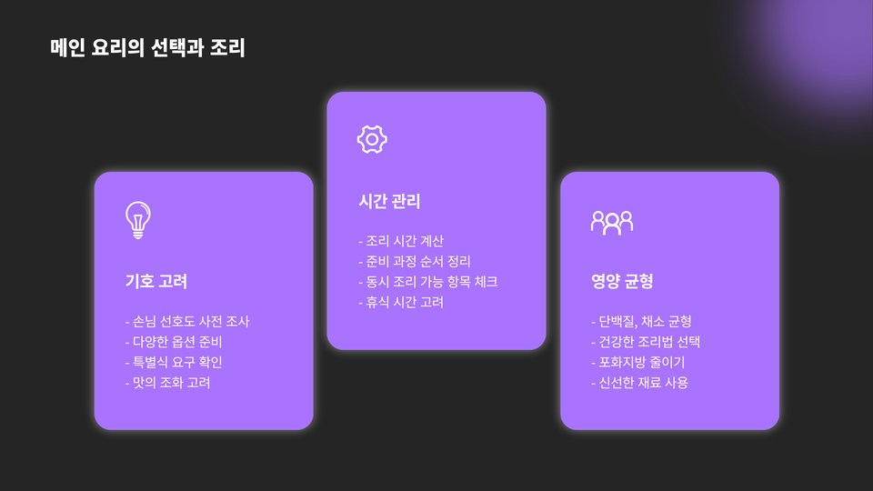 손님초대 요리에서 효율적인 조리 계획이 필요한 이유는 여러 가지가 있습니다. 여러 가지 요리를 동시에 준비해야 할 때, 시간 계획이 매우 중요합니다. 예를 들어, 여기서 제안하는 방법은 주 요리, 사이드 디시, 그리고 디저트를 준비하는 순서를 정하는 것입니다. 주 요리를 먼저 조리한 후, 그 시간 동안 사이드 디시를 조리하고, 마지막으로 디저트를 준비하는 식으로 시간 분배를 하는 것이 효율적입니다.