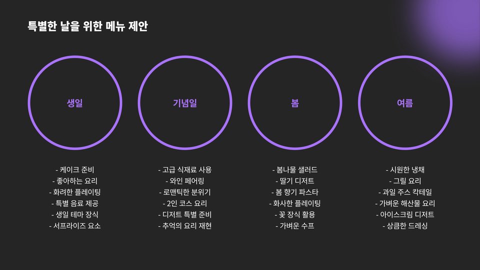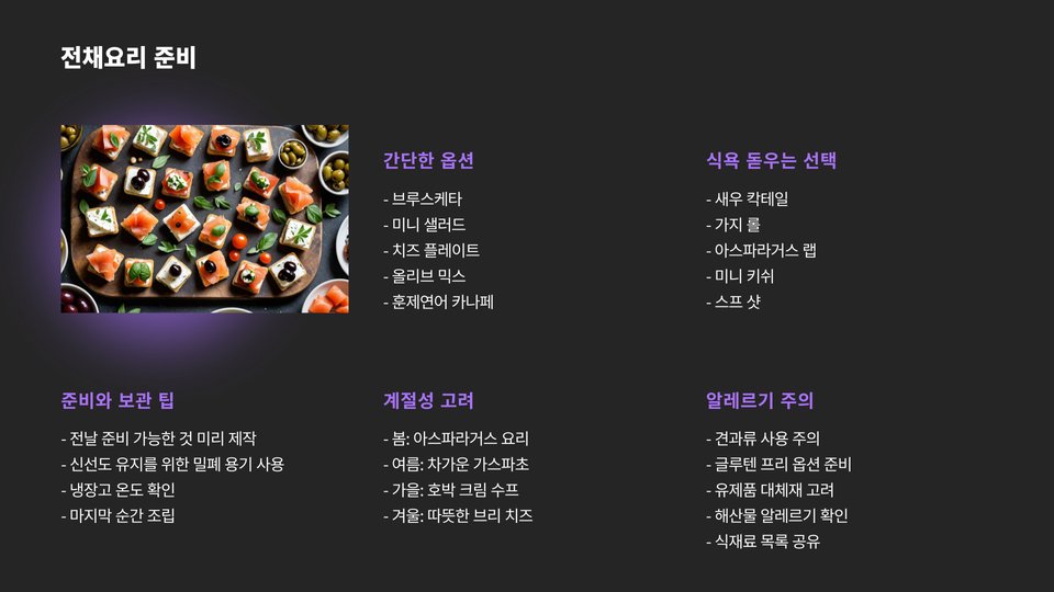 효율적인 메뉴 구성을 위해서는 미리 계획하는 것이 중요합니다. 주 요리, 사이드, 디저트, 음료 등을 고려하여 메뉴를 짜면 좋습니다. 예를 들어, 주 요리로는 불고기나 제육볶음을 선택하고, 사이드로는 김치와 잡채를 추가할 수 있습니다. 디저트로는 과일 샐러드나 떡을 준비하면 좋습니다.
