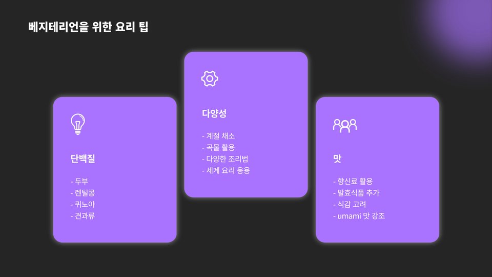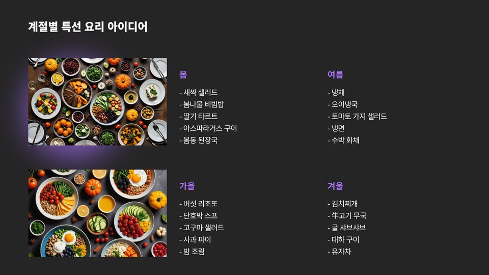 - 신선한 재료를 선택하고, 계절에 맞는 농산물을 활용하라.