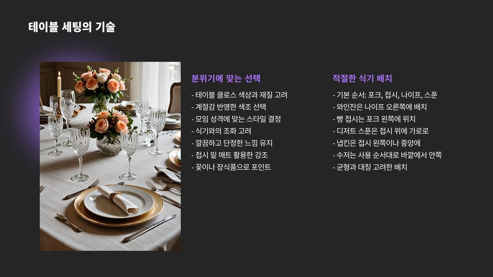 또한, 식탁 세팅에 있어서는 각자에게 맞는 식기와 수저를 준비하고, 꽃이나 촛불 등으로 장식하여 더욱 특별한 느낌을 줄 수 있습니다. 손님이 들어왔을 때 따뜻한 환영 인사를 잊지 마세요. 그리고 음식을 서빙할 때는 각 요리의 특징이나 맛을 설명해 주면 손님이 더 흥미를 느낄 수 있습니다.