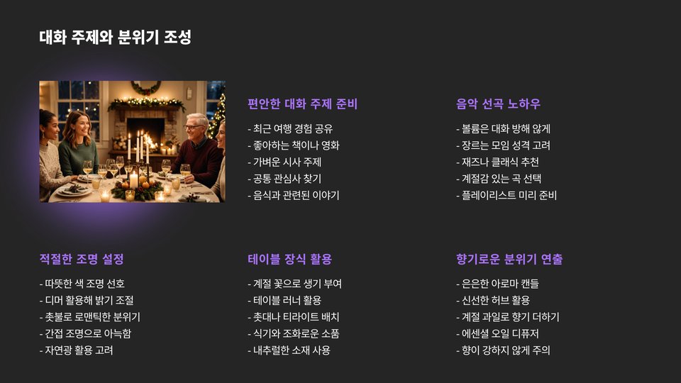 손님을 초대하는 것만큼이나 중요한 것은 분위기 조성입니다. 적절한 음악, 조명, 테이블 세팅 등은 손님에게 편안함과 즐거움을 줍니다. 예를 들어, 부드러운 재즈 음악을 배경으로 흐르게 하고, 따뜻한 조명으로 아늑한 분위기를 만드는 것이 좋습니다.