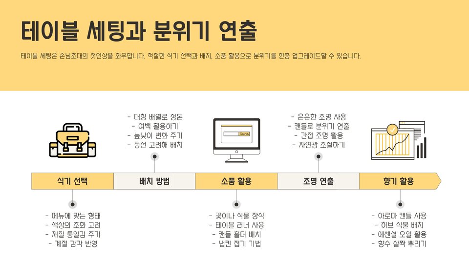 요리뿐만 아니라 손님을 맞이하는 분위기 조성도 중요합니다. 테이블 세팅은 손님들에게 첫인상을 남기는 중요한 요소입니다. 예쁜 식기와 테이블보로 테이블을 꾸며보세요. 조명과 음악도 분위기를 한껏 돋워줄 수 있습니다.