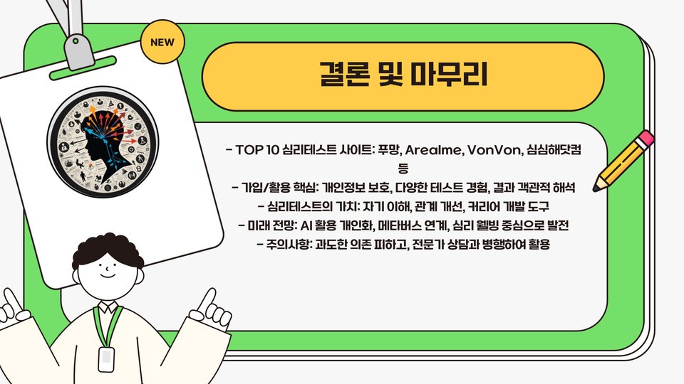 위에서 소개한 심리테스트 사이트는 각각의 특징과 장점이 있으며, 자신에게 맞는 테스트를 선택하여 활용할 수 있습니다. 가입 방법도 간단해 누구나 쉽게 접근할 수 있으니, 오늘부터 자신의 심리를 탐구해 보세요!