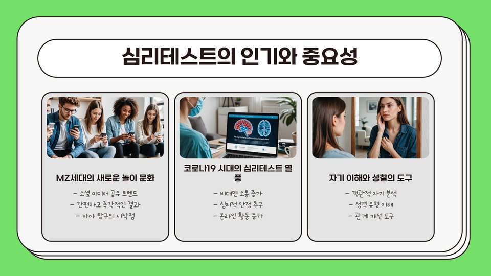 Tags: 심리테스트, 성격 검사, MBTI, 스트레스 검사, 우울증, 자기계발, 창의성, 연애 심리, 직업 적성, 감정 상태