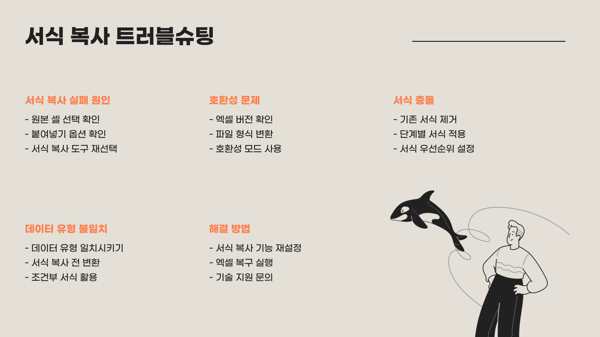또한, 데이터 유형에 따라 서식이 다르게 적용될 수 있으므로, 셀의 데이터 유형을 체크하는 것이 중요합니다. 만약 문제가 계속된다면, 엑셀 파일을 새로 열어 서식을 다시 복사해보는 것도 좋은 방법입니다. 이러한 문제들은 간단한 점검으로 쉽게 해결할 수 있습니다.