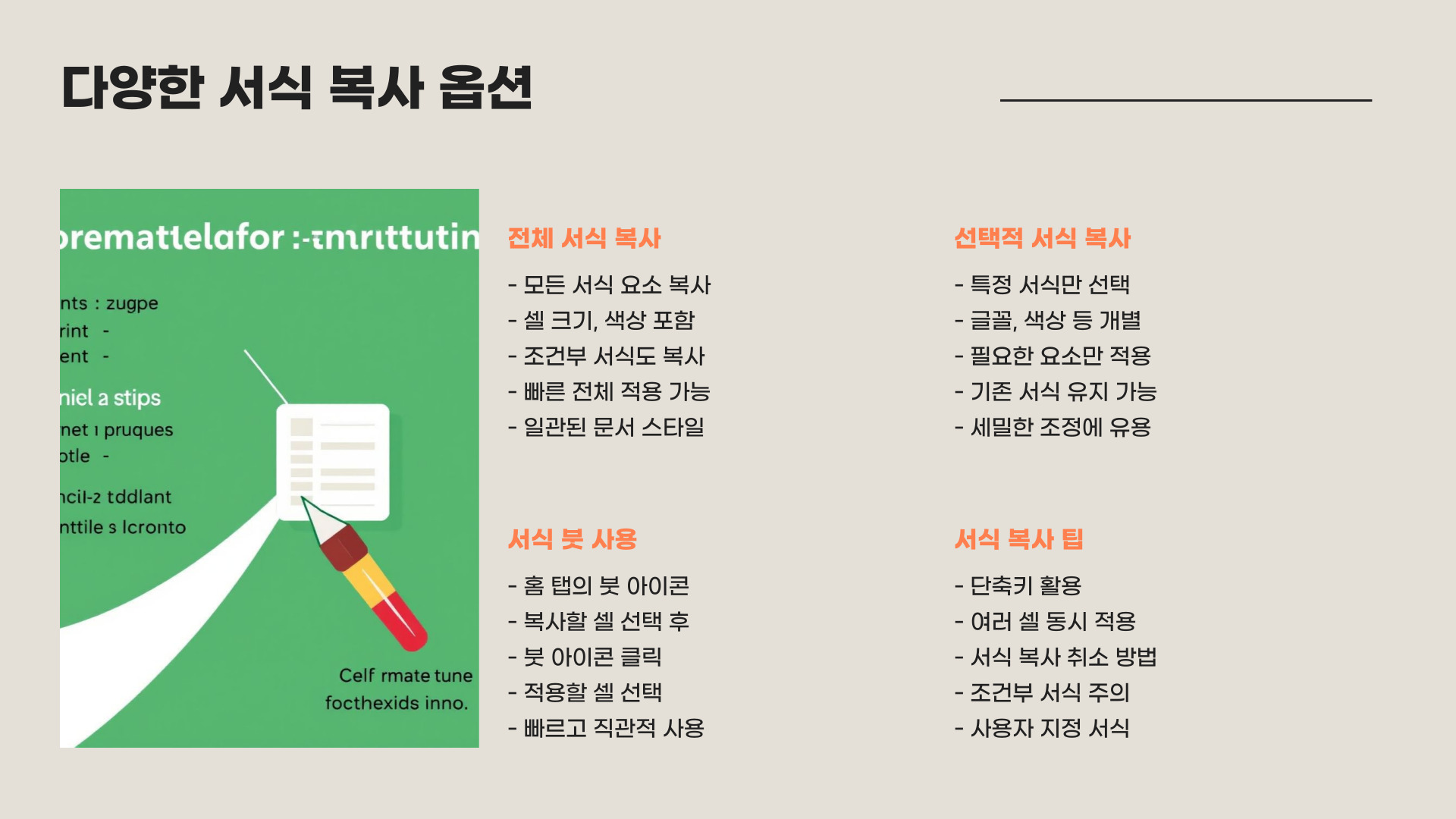 서식 복사 도구인 '서식 복사기'를 사용하는 것도 좋은 방법입니다. 이 도구는 도구 모음에서 쉽게 찾을 수 있으며, 서식을 복사하고 싶은 셀을 선택한 후, 서식 복사기를 클릭하고 원하는 셀에 적용하면 됩니다. 서식 복사기는 여러 셀에 동일한 서식을 적용할 때 매우 유용합니다. 예를 들어, 보고서에서 여러 셀에 동일한 텍스트 색상이나 글꼴 스타일을 적용할 때 효과적입니다.