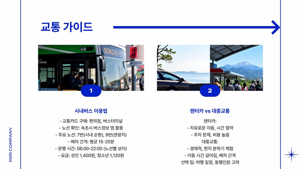 속초를 여행할 때는 몇 가지 유용한 팁을 기억하는 것이 좋습니다. 첫째, 교통편을 미리 계획하세요. 속초는 대중교통이 잘 되어 있지만, 자가용을 이용하는 것도 좋은 방법입니다. 주차 공간이 부족할 수 있으니 주의하세요! 특히 성수기에는 혼잡하니 일찍 출발하는 것이 좋습니다.