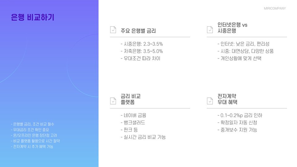 | 금리 비교 | 여러 금융기관의 금리를 비교하여 유리한 조건 찾기 |