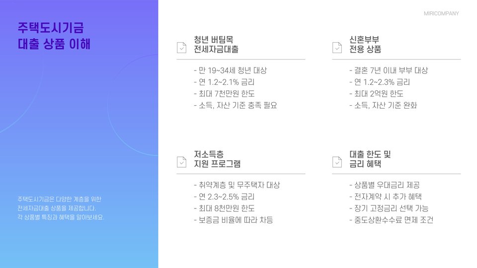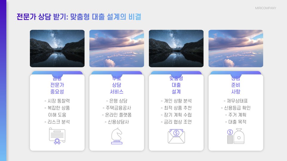 | 상품 비교 | 여러 금융기관의 대출 상품을 비교하여 가장 좋은 조건을 찾으세요. |