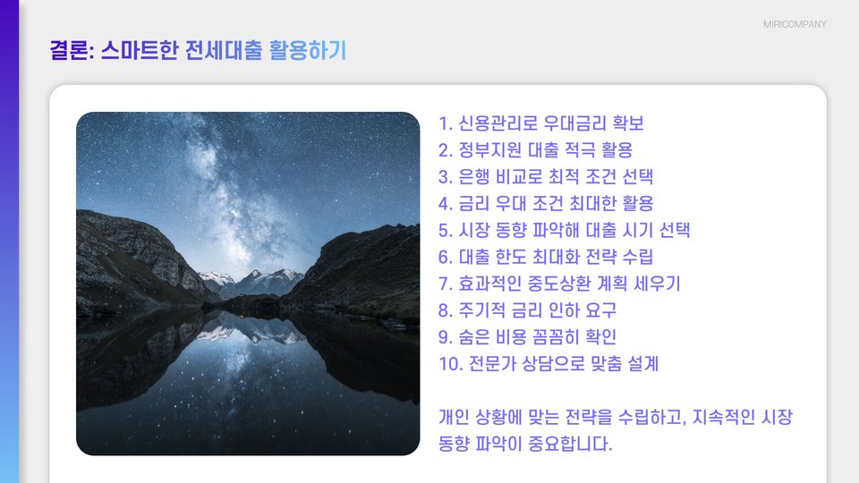 전세대출금리는 많은 요인에 의해 영향을 받으며, 이를 관리하는 방법 또한 다양합니다. 신용 점수 확인, 다양한 금융기관 비교, 금리 인하 요청 등은 금리를 낮추는 데 도움이 되는 좋은 방법입니다. 또한, 대출 후 상환 계획을 잘 세우는 것이 중요합니다. 이러한 팁들을 통해 전세대출을 더 유리하게 활용할 수 있기를 바랍니다.