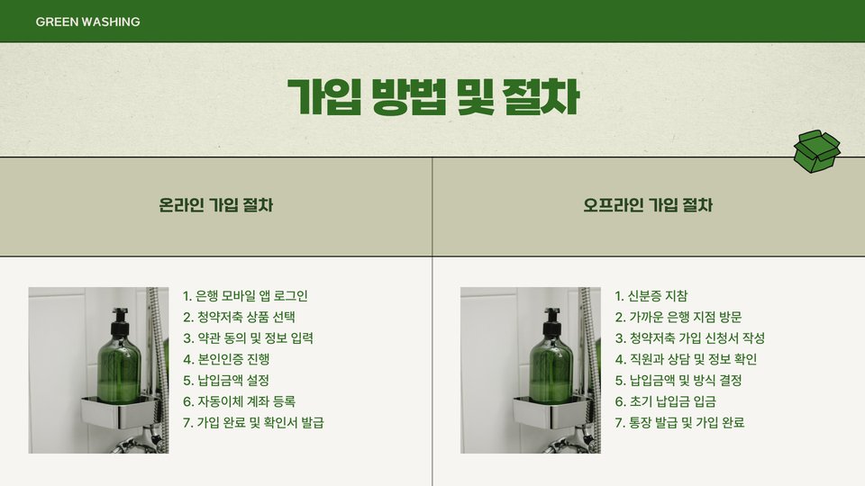 가입 방법은 대체로 간단합니다. 원하는 금융 기관을 방문하거나 온라인 뱅킹 시스템을 통해 직접 신청할 수 있습니다. 일반적으로 은행 창구에서의 상담과 절차가 필요하며, 전자 서명 역시 가능하므로 편리합니다. 가입 후에는 정해진 규칙에 따라 매월 일정 금액을 저축해야 합니다.