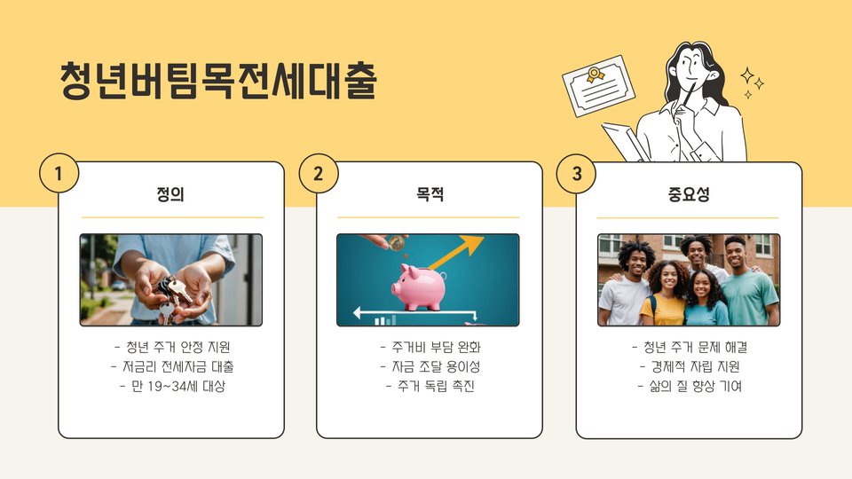 청년버팀목전세대출은 청년층의 주거 안정을 위해 정부에서 지원하는 제도입니다. 이 대출은 주로 전세 자금을 마련하는 데 도움을 주며, 청년들이 고정된 금액으로 전세를 구할 수 있도록 돕습니다. 청년들이 경제적으로 부담을 덜 수 있도록 설계되어 있어 주거 안정에 기여하는 목표를 가지고 있습니다. 대출의 이자율은 낮고, 상환 기간도 유연하게 설정되어 있어 많은 청년들에게 실질적인 도움이 되고 있습니다.