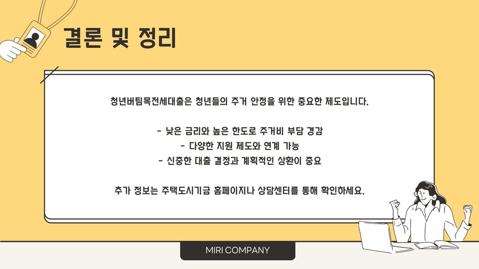 이상으로 청년버팀목전세대출에 대한 완벽 가이드를 마칩니다. 청년들의 주거 안정과 경제적 자립을 위한 이 프로그램이 많은 도움이 되기를 바랍니다. 궁금한 점이 있다면 언제든지 전문가 또는 은행에 문의하여 더 많은 정보를 얻는 것이 중요합니다.