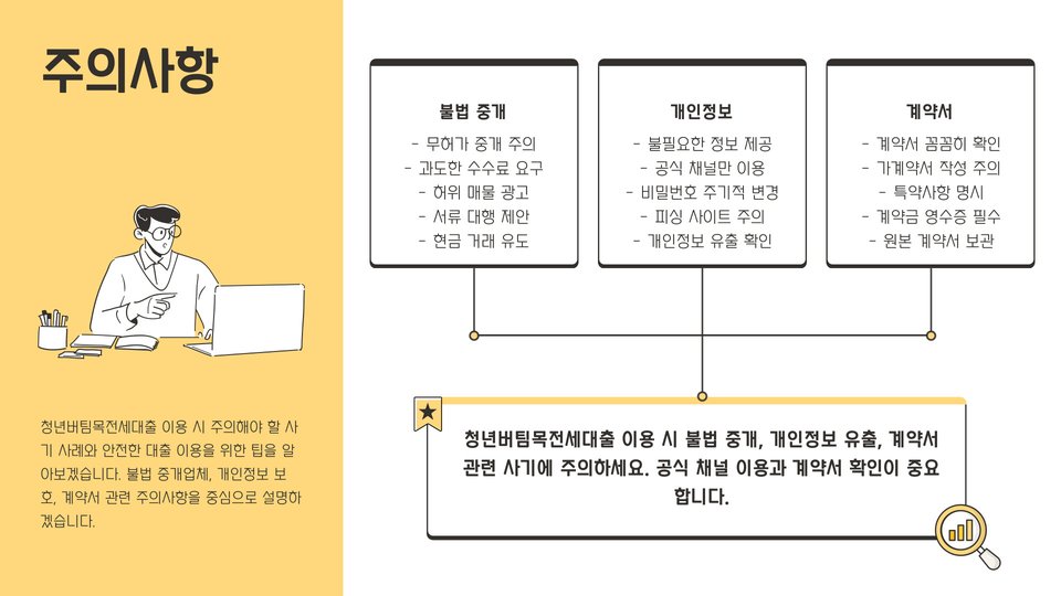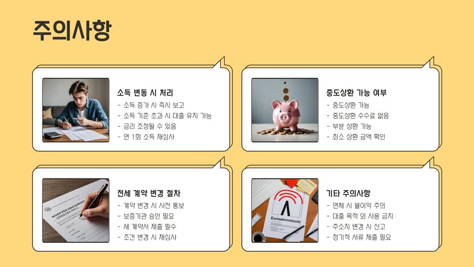 대출을 진행하기 전에 알아두어야 할 사항들이 있습니다. 첫째, 청년버팀목전세대출은 주거 안정을 위한 프로그램이지만, 대출금을 제때 상환하지 않을 경우 개인의 신용도에 악영향을 미칠 수 있습니다. 따라서 대출 상환 계획을 철저하게 세워야 합니다.