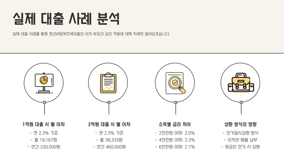 청년버팀목전세대출의 상환 방법은 금융기관에 따라 다소 차이가 있을 수 있지만, 일반적으로 원리금 균등 상환 방식이 많이 사용됩니다. 이는 매달 일정 금액을 상환하는 방식으로, 청년들이 예측 가능한 지출로 관리할 수 있도록 돕습니다. 또한, 대출 이자율이 낮아 부담이 적은 편입니다. 상환 기간은 보통 2년에서 5년까지 다양하게 설정할 수 있습니다.