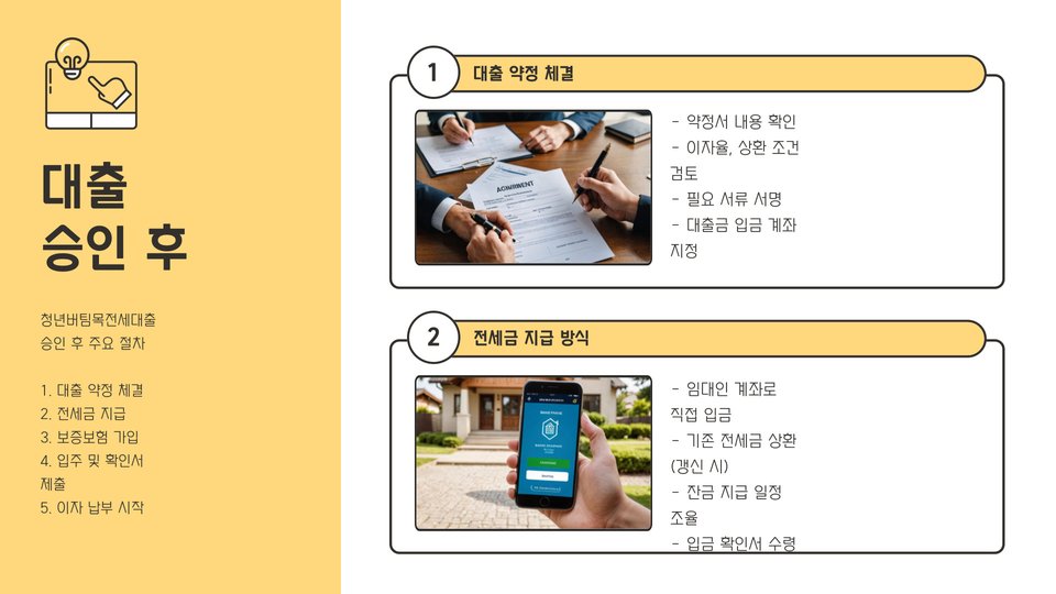 대출 신청 시 필요한 서류도 있습니다. 주민등록등본, 소득증명서, 전세 계약서 등이 필요하며, 이 서류들은 대출 심사 과정에서 필수적으로 제출해야 합니다. 각 서류는 정확하게 준비 해야 하며, 누락될 경우 대출 심사에 지연이 발생할 수 있습니다. 그러므로 서류 준비는 미리 해 두는 것이 좋습니다.