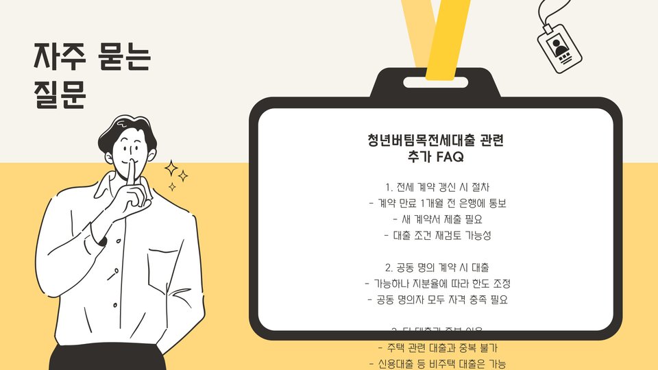 이상으로 청년버팀목전세대출에 대한 완벽 가이드를 마칩니다. 청년들의 주거 안정과 경제적 자립을 위한 이 프로그램이 많은 도움이 되기를 바랍니다. 궁금한 점이 있다면 언제든지 전문가 또는 은행에 문의하여 더 많은 정보를 얻는 것이 중요합니다.