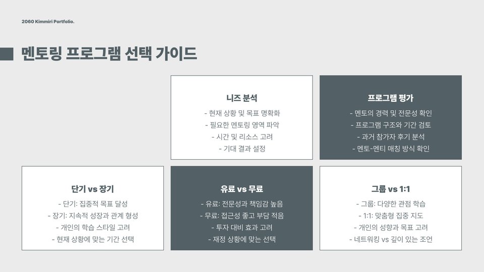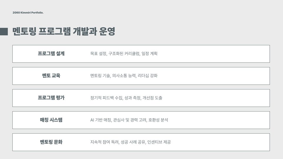 | 지속적인 관계 형성 | 신뢰를 바탕으로 한 장기적인 멘토-멘티 관계 목표. |