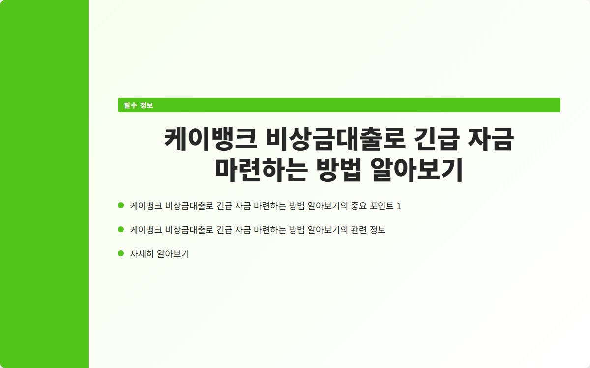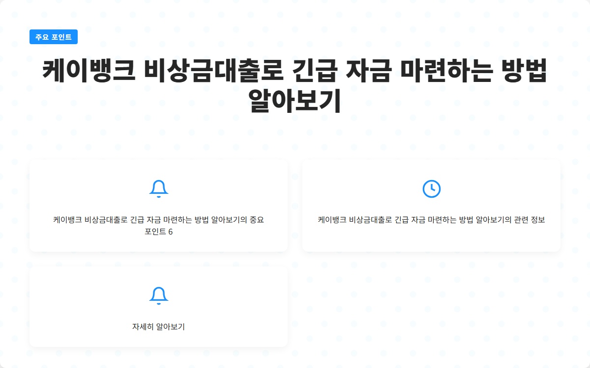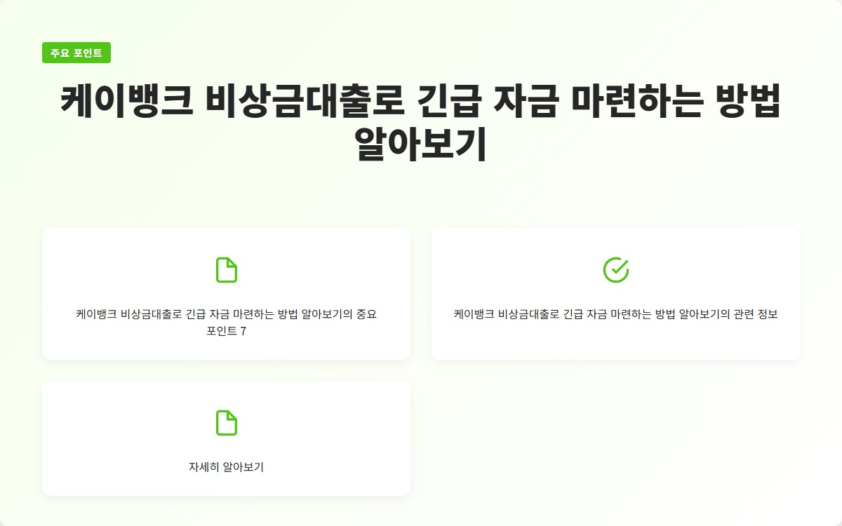 오늘날의 금융 환경에서 불시의 자금 필요성은 누구에게나 발생할 수 있습니다. 갑작스러운 의료비나 예상치 못한 지출이 있을 때, 케이뱅크 비상금대출은 즉각적으로 필요한 자금을 마련하는 데 매우 유용합니다. 이 대출 상품은 특별히 긴급 상황을 고려하여 설계되었으며, 신속하고 간편하게 이용할 수 있습니다. 특히 모바일 앱을 통해 언제 어디서나 신청할 수 있어 많은 이들에게 큰 인기를 끌고 있습니다.