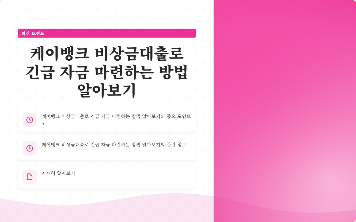 최근 경제 상황이 불확실해지면서 비상금대출에 대한 관심이 높아지고 있습니다. 특히 케이뱅크 비상금대출은 빠르고 간편한 절차로 많은 이들에게 인기를 끌고 있습니다. 이 글에서는 케이뱅크 비상금대출의 특징과 신청 방법, 자주 묻는 질문들을 자세히 알아보겠습니다.