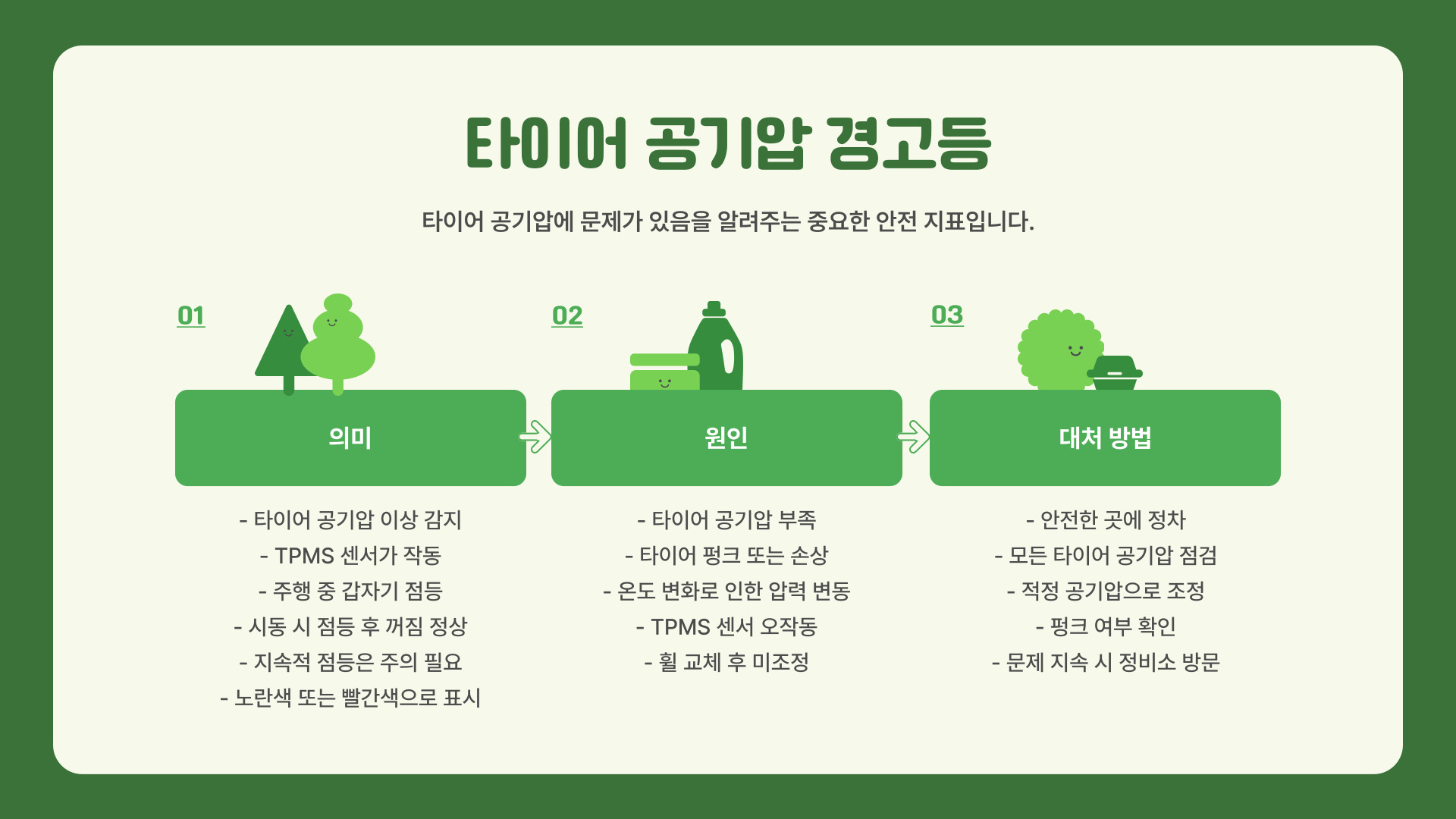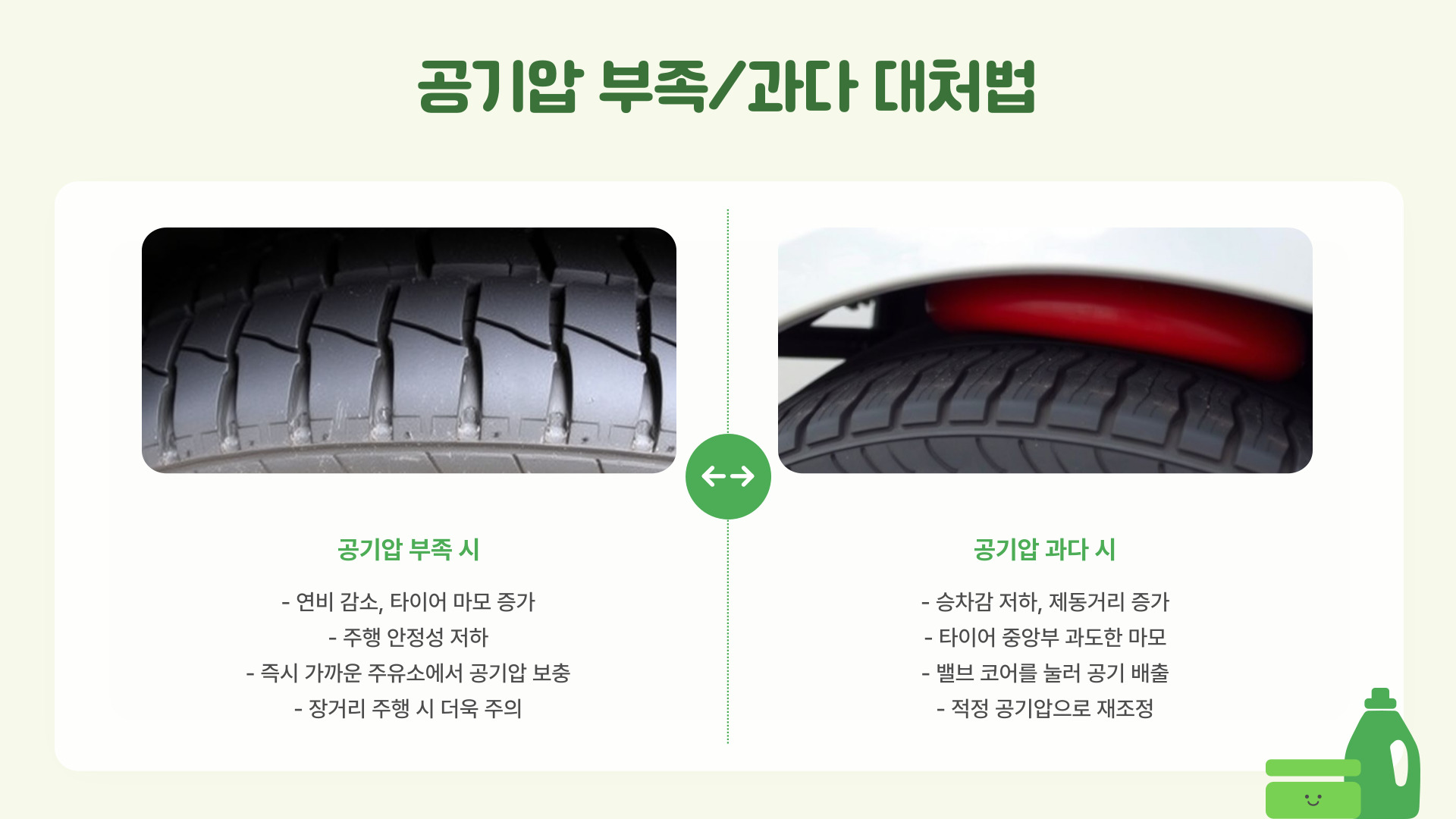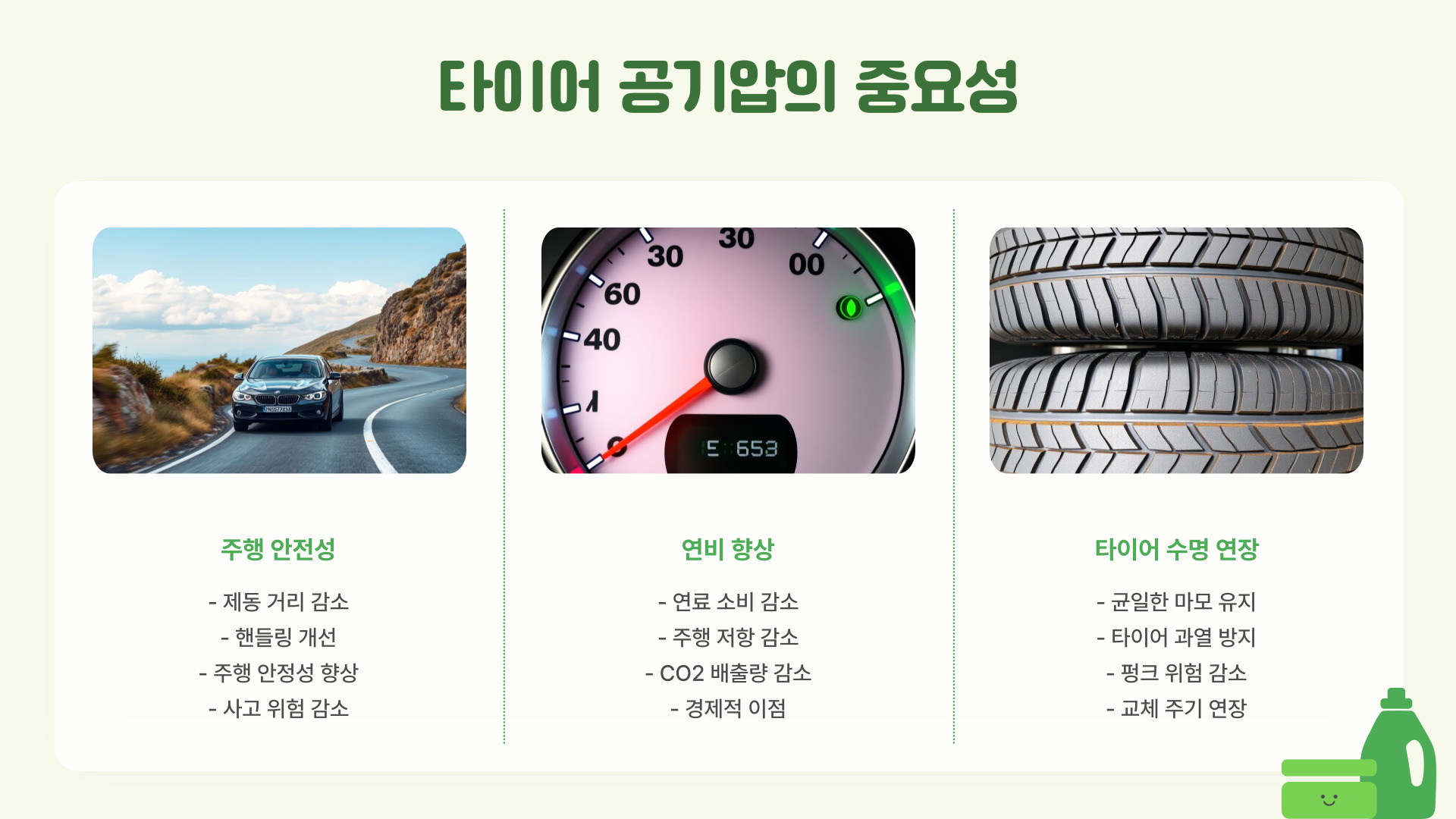 안전 운전 | 정기적인 공기압 체크 및 타이어 관리 |