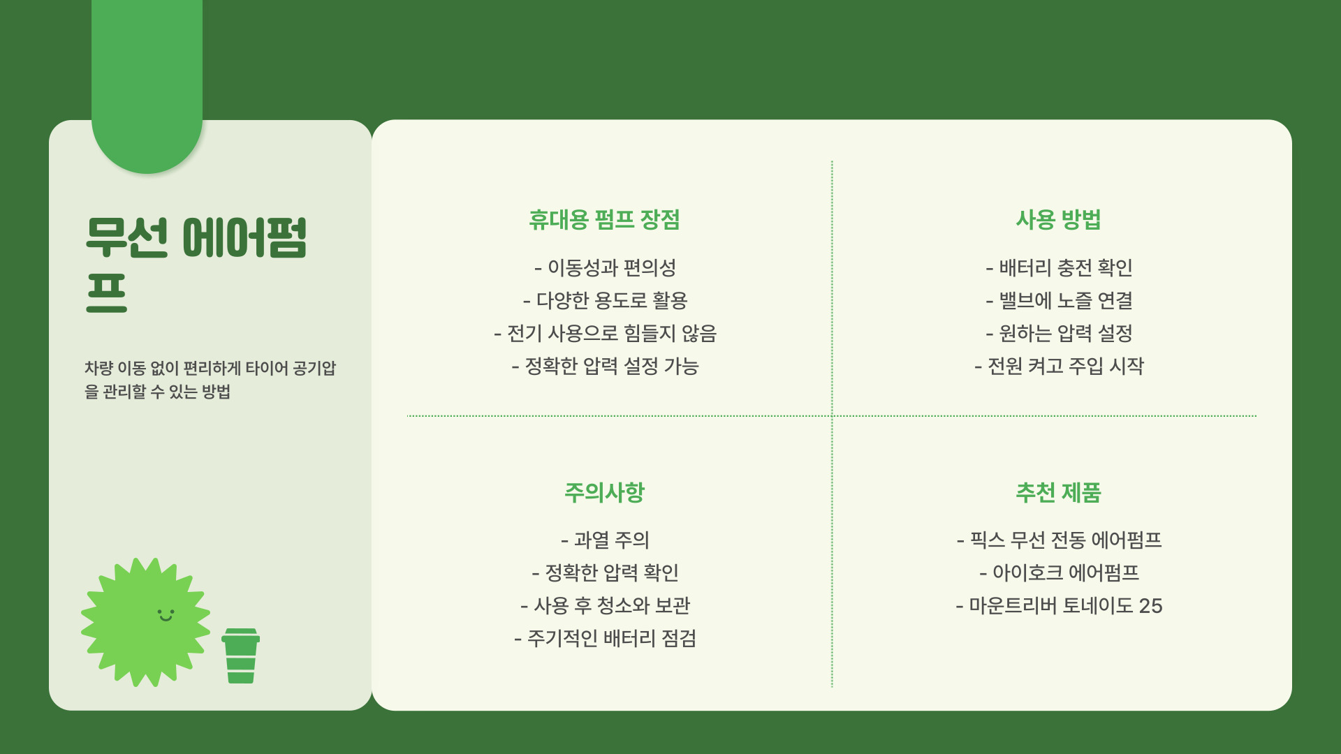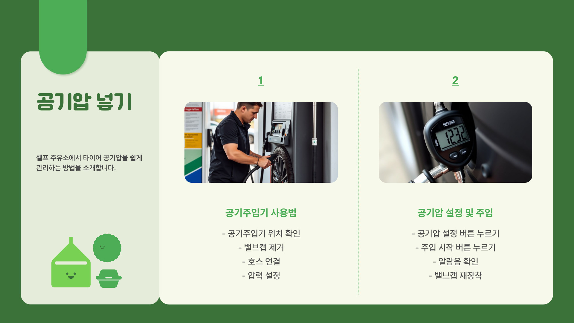 - 주유소에서 공기 주입기를 이용해 쉽게 공기 추가 가능