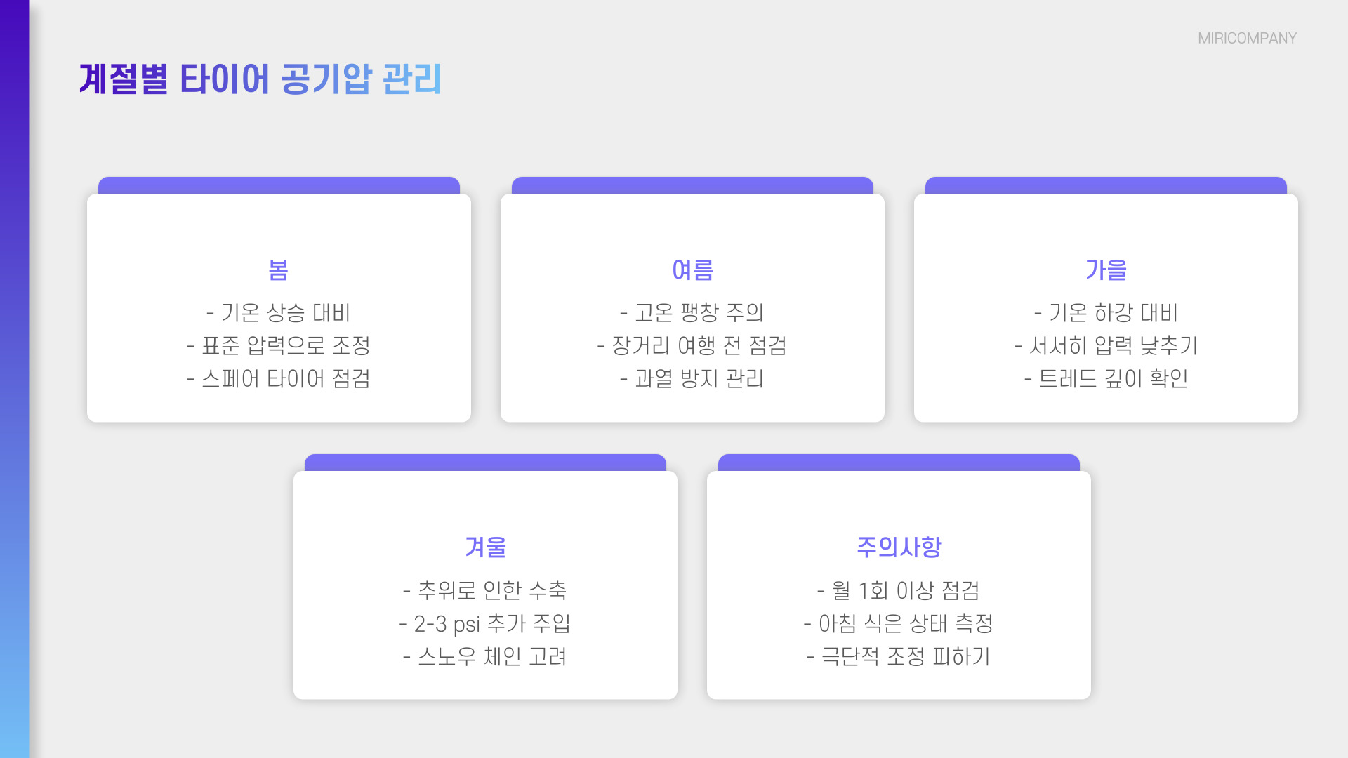 - 온도 변화에 따라 공기압이 달라질 수 있으므로 계절별 점검이 필요합니다.