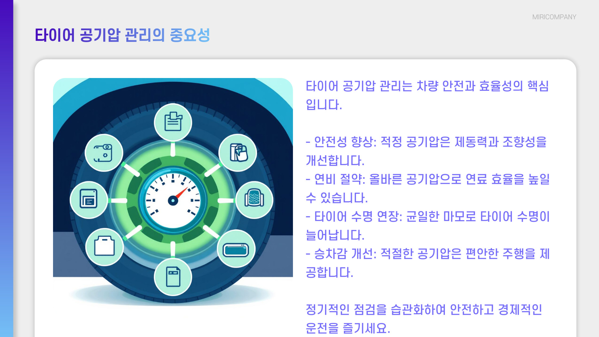 - 타이어 공기압은 차량의 성능과 안전에 큰 영향을 미침.