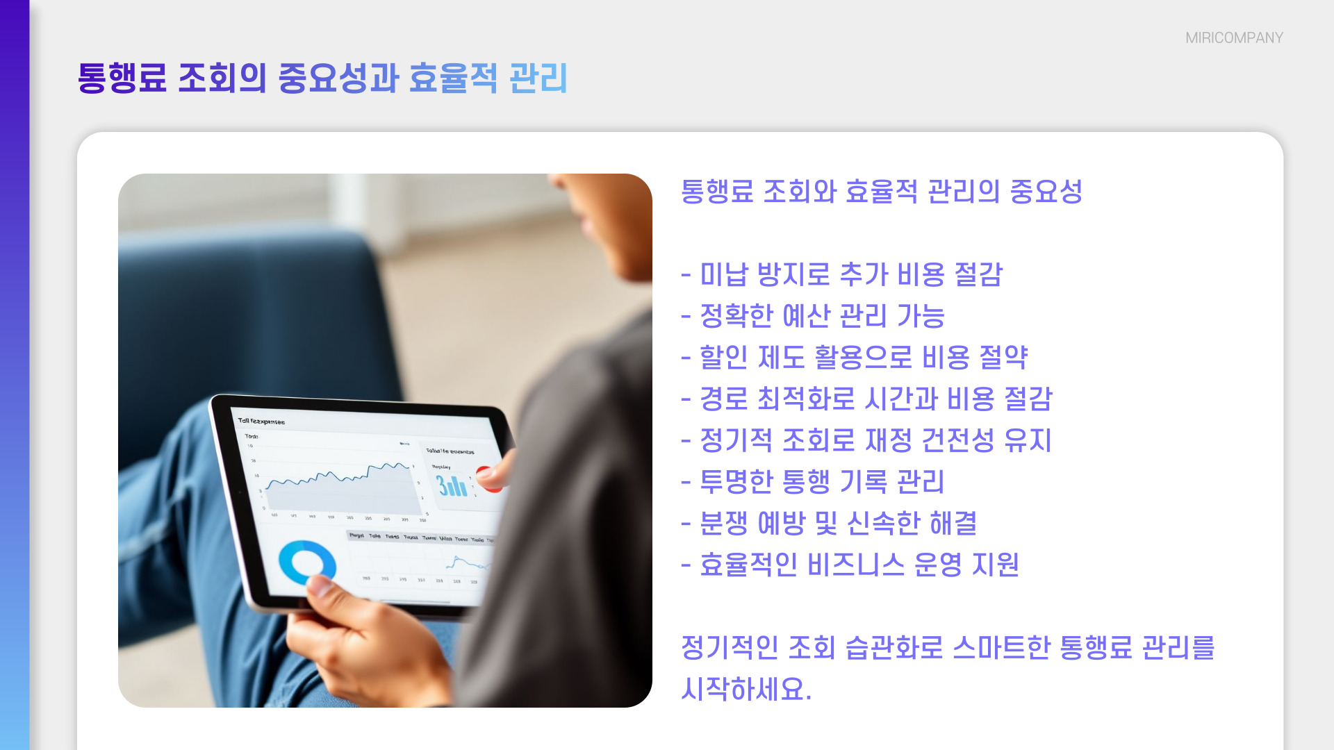 고속도로를 자주 이용하는 분들은 통행료 조회의 중요성을 잘 알고 계실 것입니다. 고속도로를 주행하면서 하이패스 단말기의 오류로 인한 통행료 미납 상황이 발생할 수 있는데, 이런 상황에 대비하여 미리 조회하고 납부 방법을 아는 것이 중요합니다. 통행료 조회를 통해 본인의 통행료 내역을 확인하고, 필요한 경우 빠르게 납부를 할 수 있습니다.