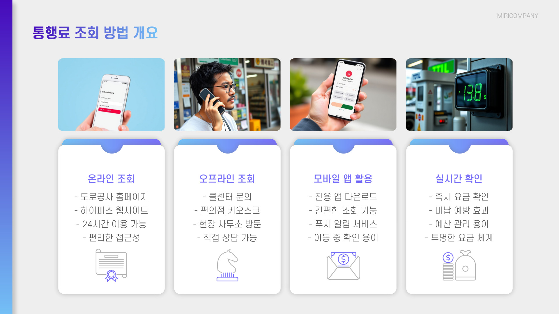 통행료 미납 사실을 확인하고 납부하기 위해서는 여러 가지 방법이 있습니다. 가장 많이 사용하는 방법은 모바일 앱과 홈페이지를 이용하는 것입니다. 두 가지 방법을 통해 통행료 미납 내역을 쉽게 확인하고, 납부하는 절차를 살펴보겠습니다.